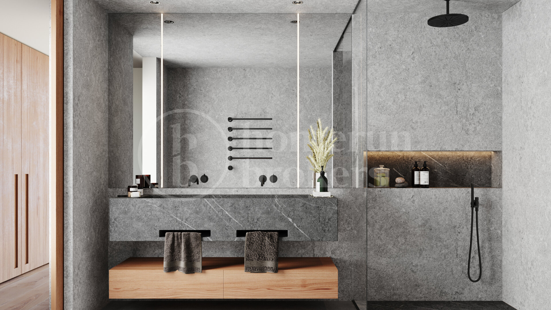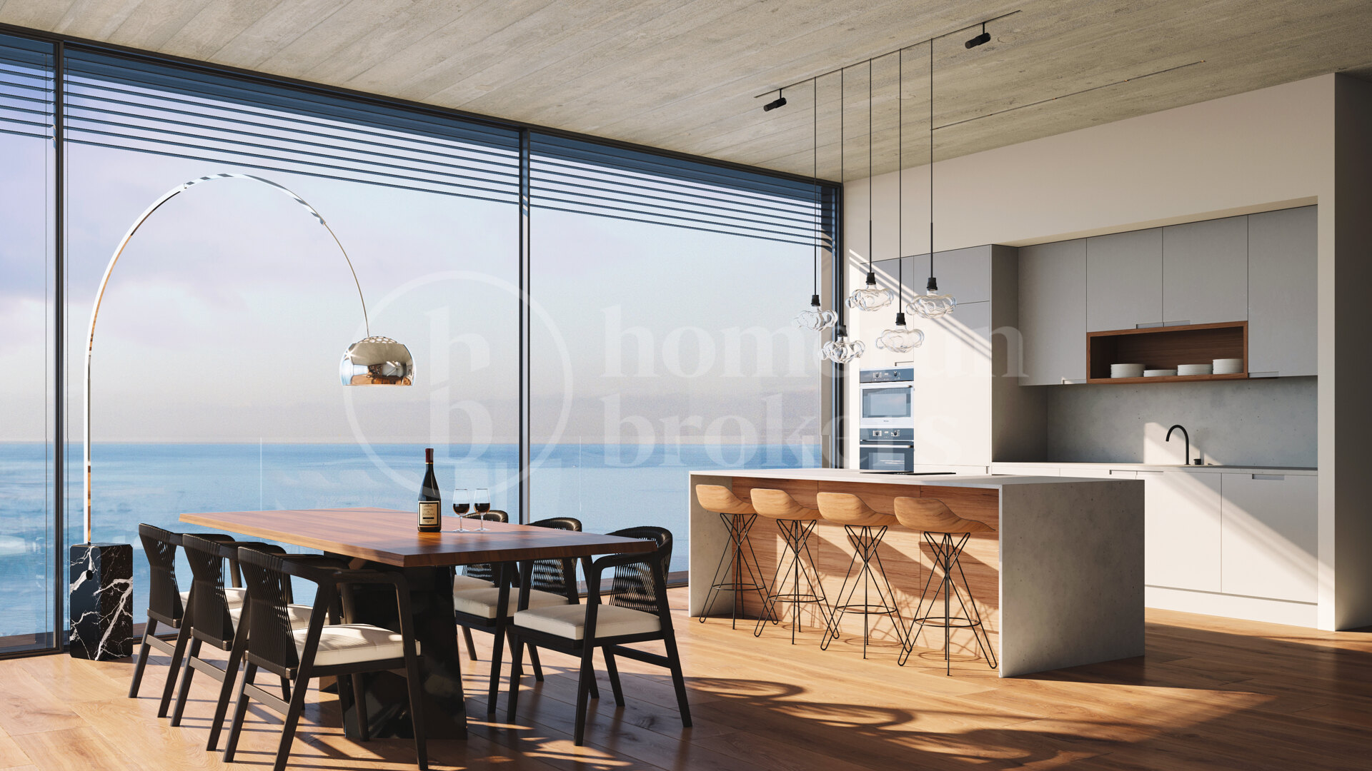 Inside, the penthouse unfolds across two floors with a layout designed for fluid living. Three bedrooms provide ample space for rest and privacy, each equipped with en-suite bathrooms and custom wardrobes. The aesthetic leans toward warm minimalism—oak-engineered flooring, exposed concrete ceilings, and a refined palette of natural textures give the space its calm, contemporary character. Full-height windows open the interiors to the scenery beyond, blurring the lines between inside and out.
