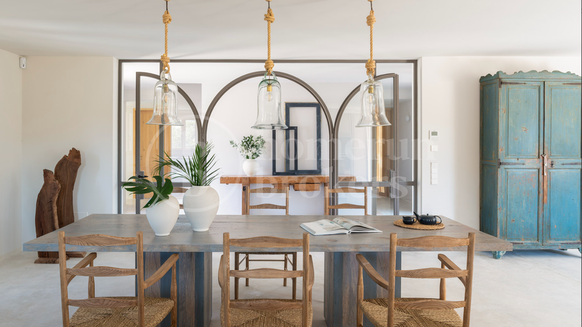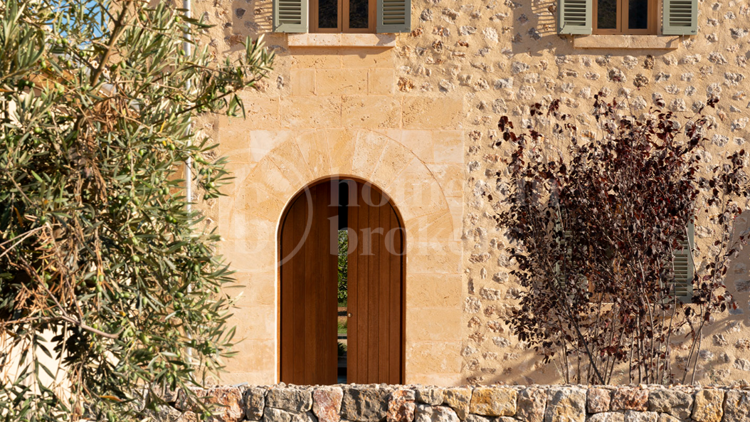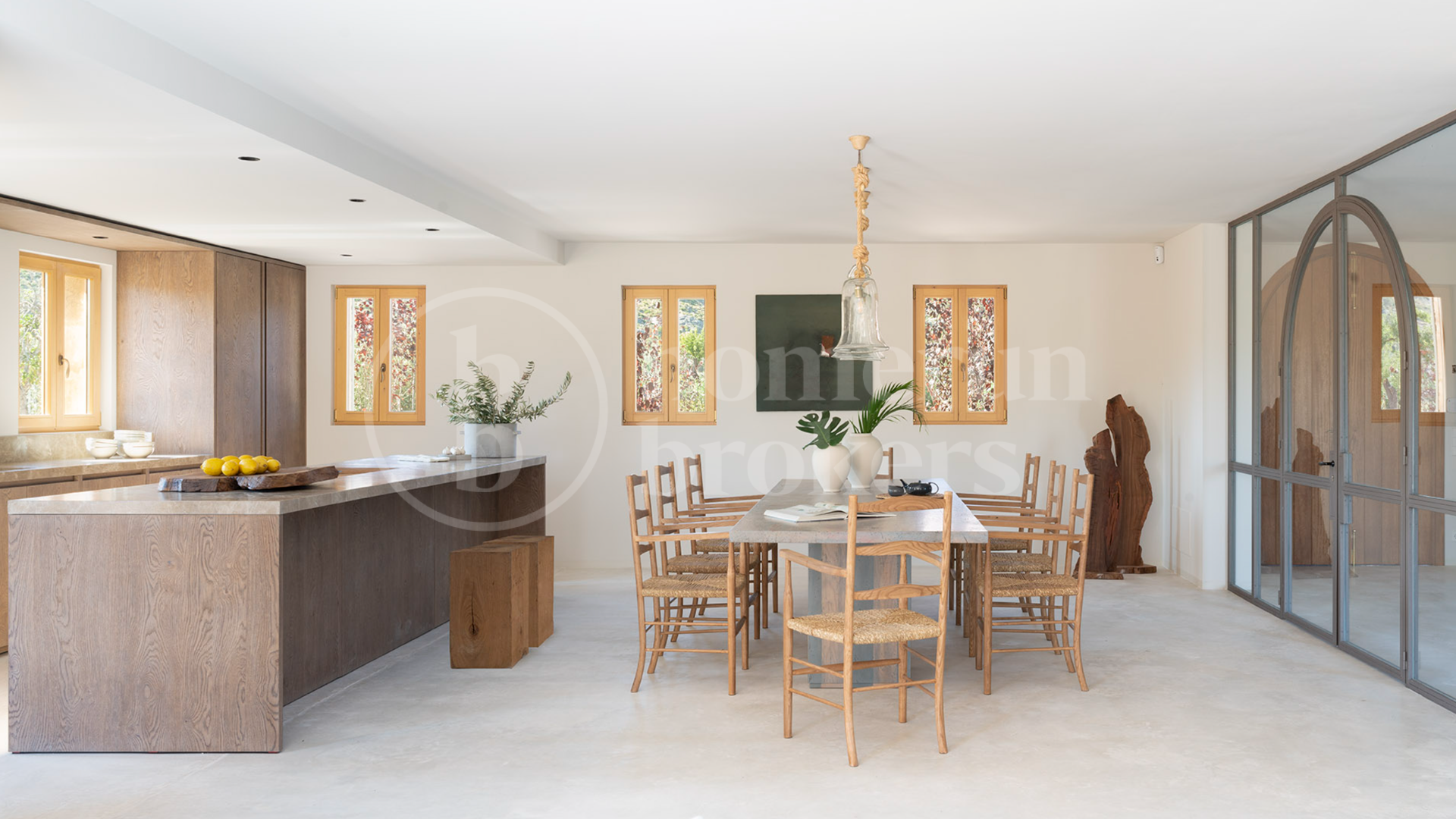 The architecture beautifully blends traditional Mallorcan finca character with a refined contemporary aesthetic. Throughout the house, custom-made carpentry highlights the craftsmanship involved from the striking handcrafted entrance door to the bespoke interior joinery.