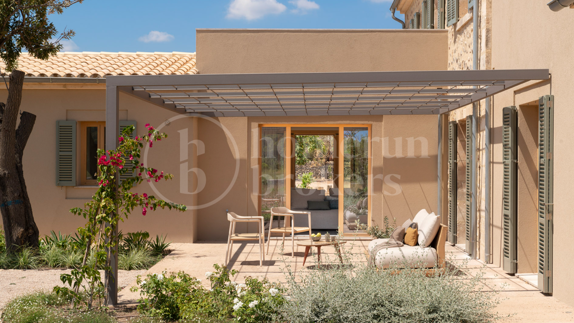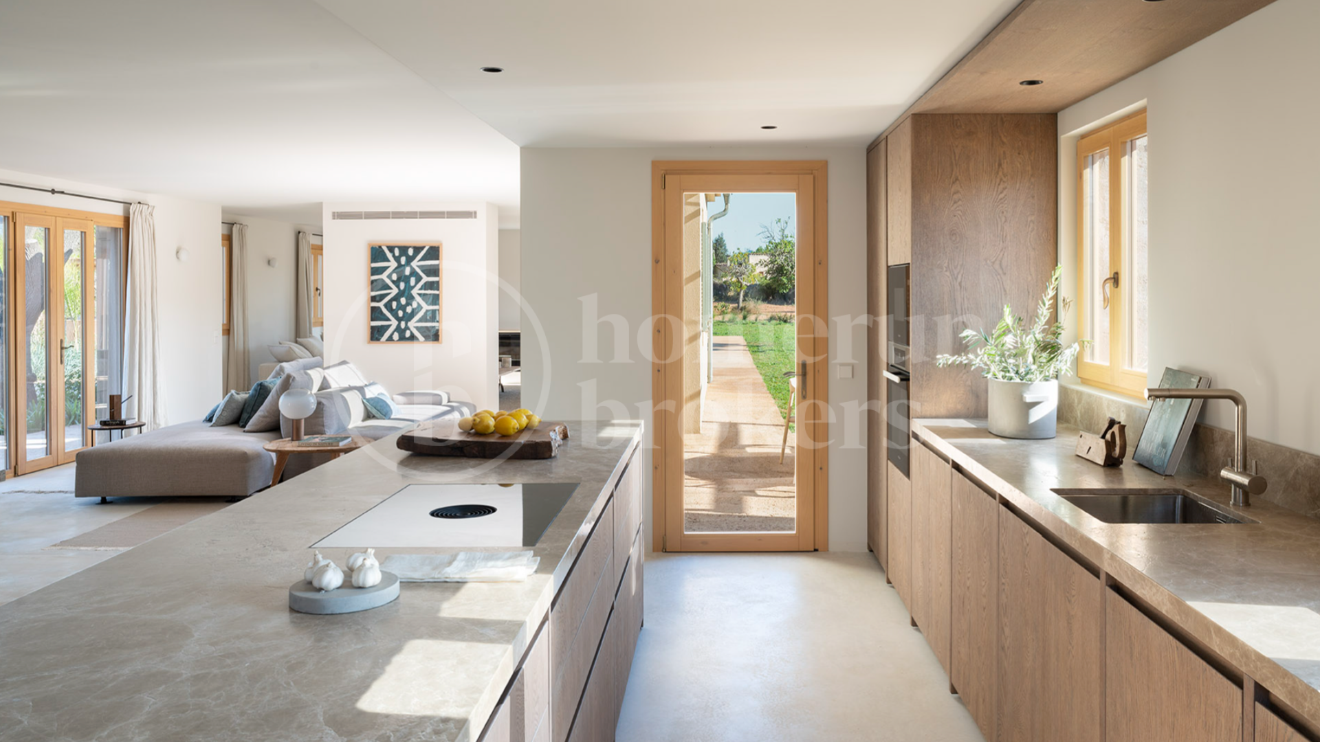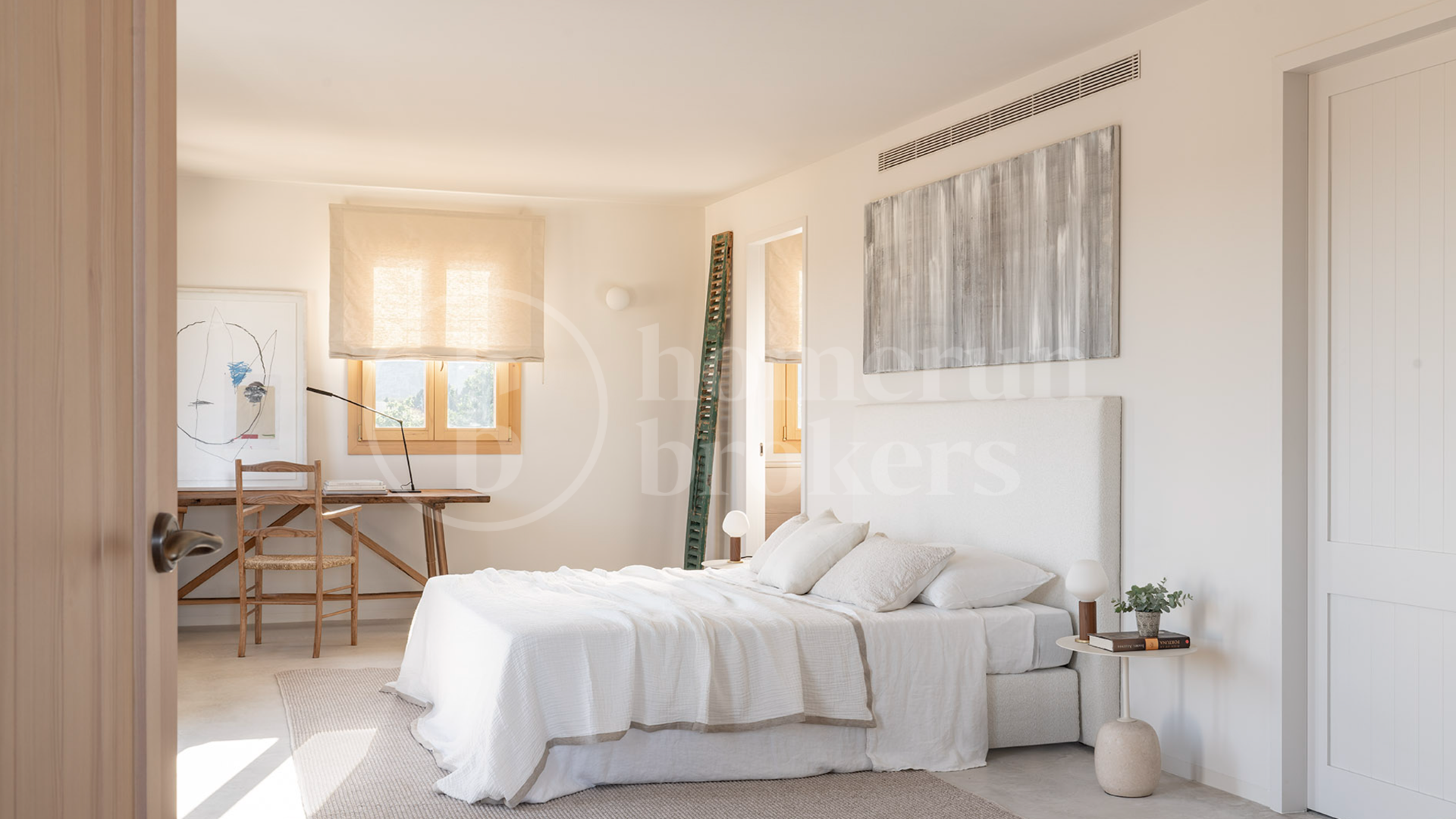 The architecture beautifully blends traditional Mallorcan finca character with a refined contemporary aesthetic. Throughout the house, custom-made carpentry highlights the craftsmanship involved from the striking handcrafted entrance door to the bespoke interior joinery.