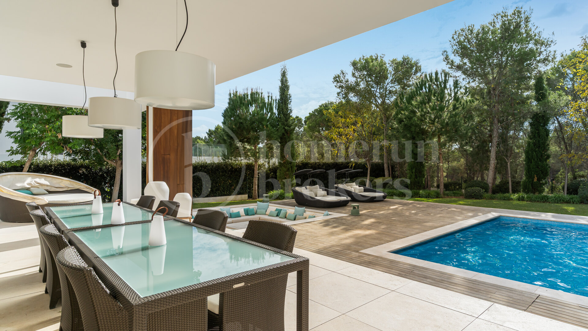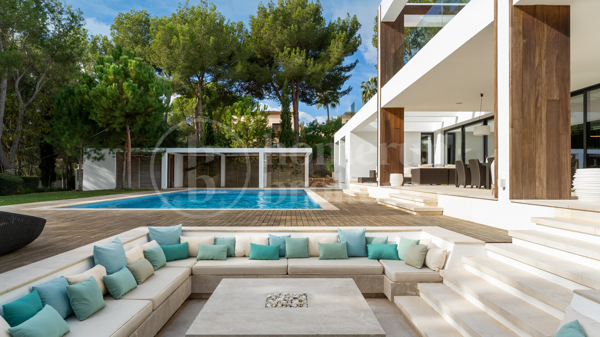The exceptional outdoor area features a 105 sqm heated saltwater pool with jacuzzi, lush landscaping, a recessed fire lounge, and multiple terraces ideal for dining and relaxation.