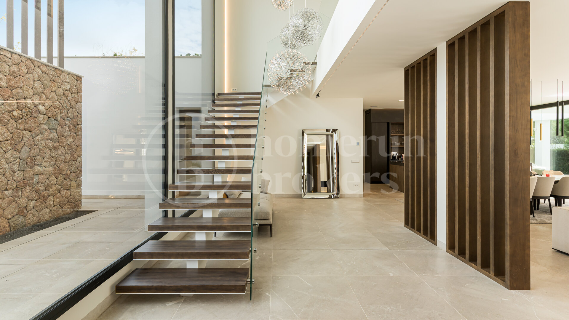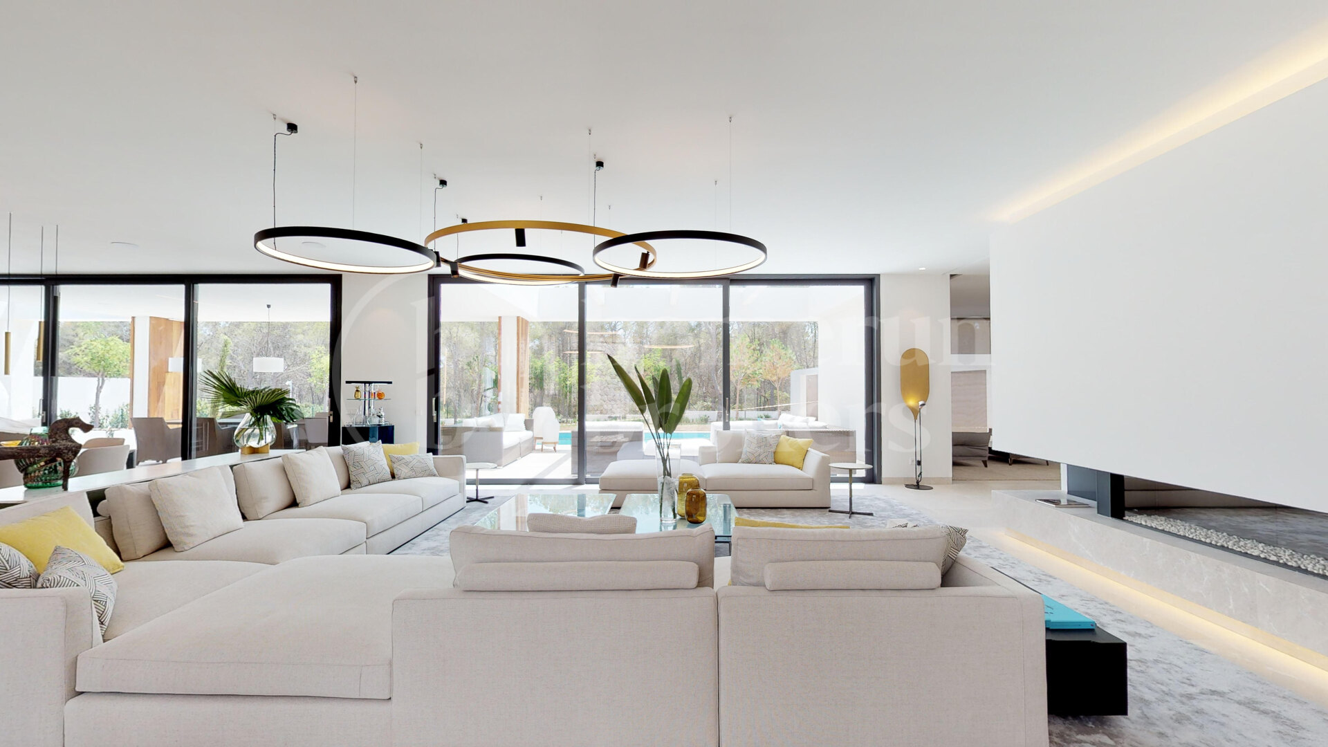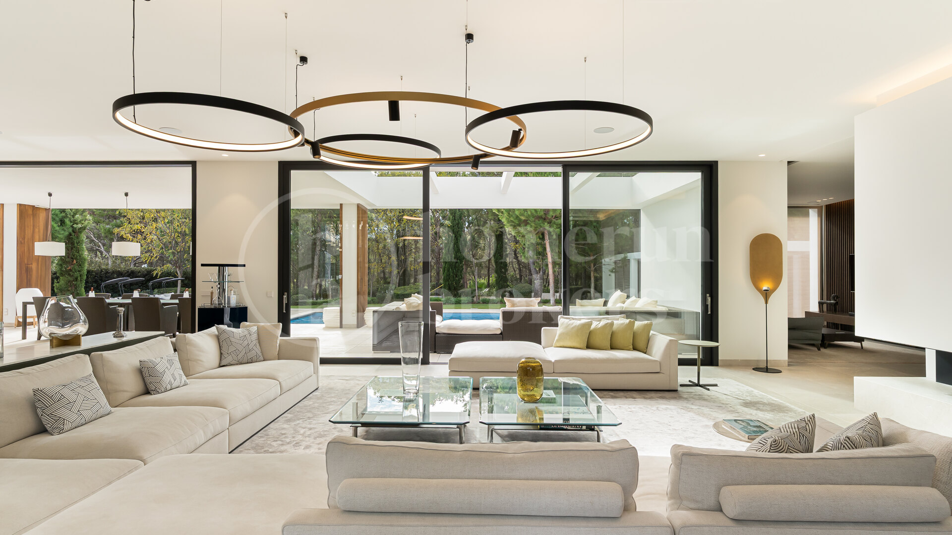 The impressive entrance featuring a water fountain, glass façade, and double-height hall, leads into an open-plan living and dining area with floor-to-ceiling windows, a fireplace, designer lighting, and a partially separate TV room. A Birgit Müller kitchen with Gaggenau appliances completes this level. Sliding doors open directly to the outdoor terraces, pool, garden, lounge, and sauna.