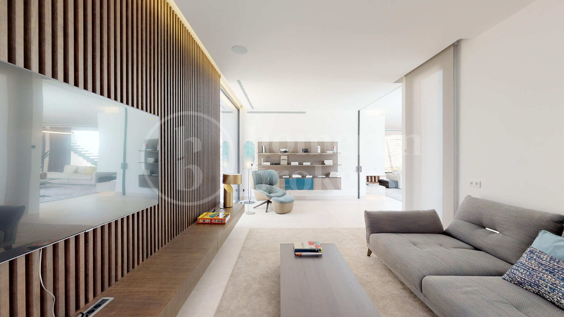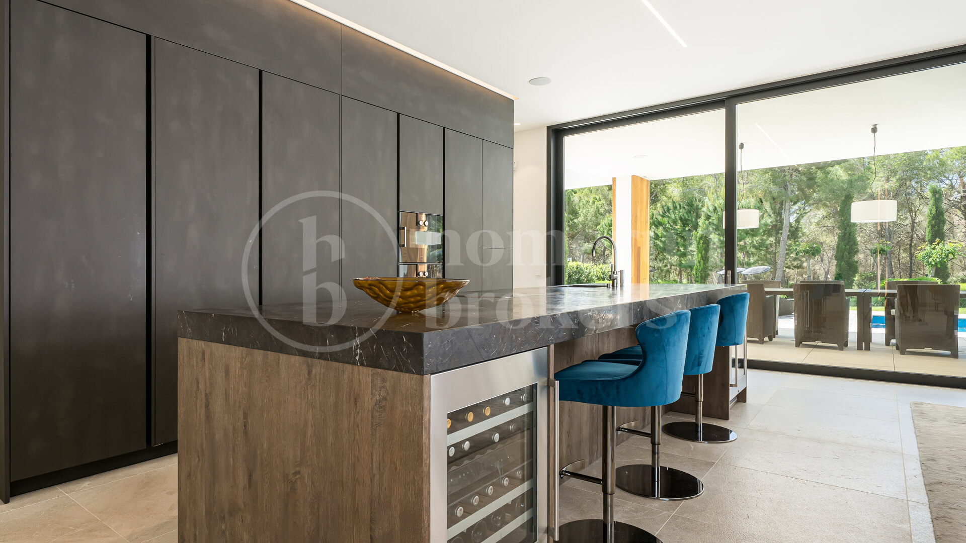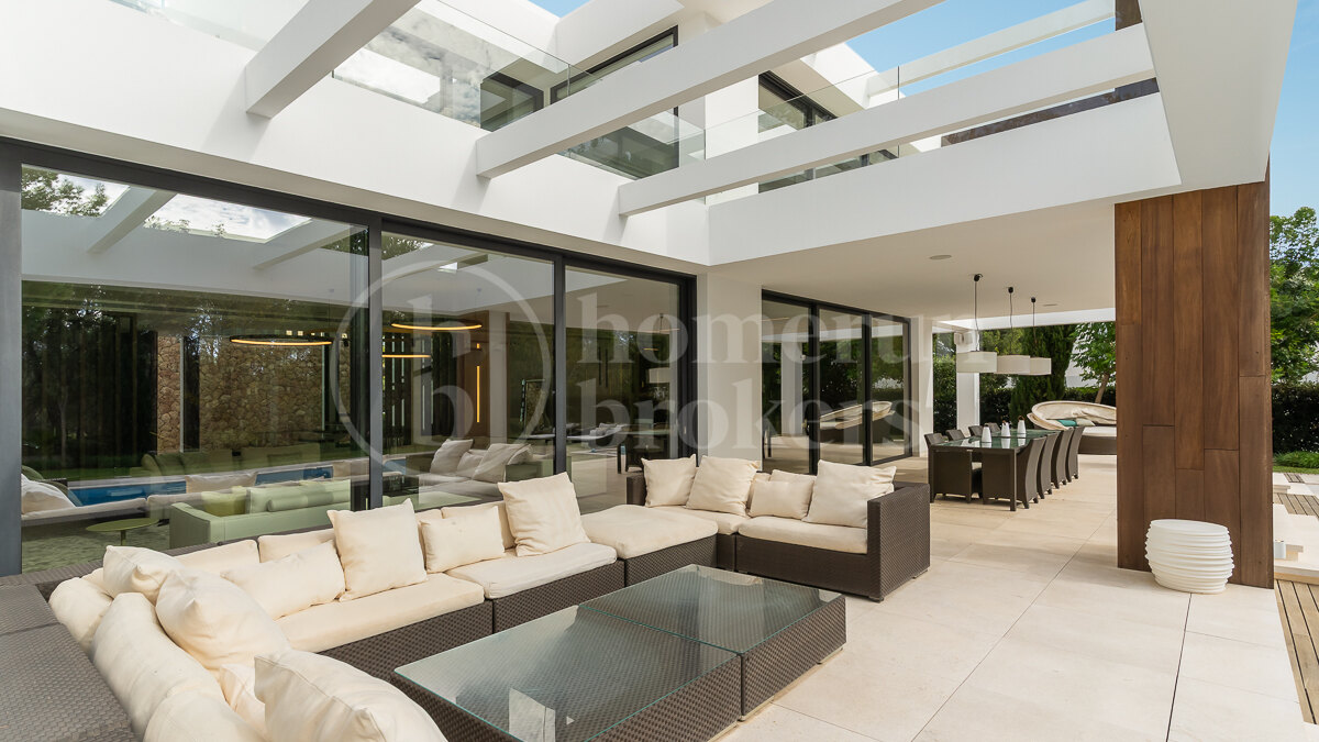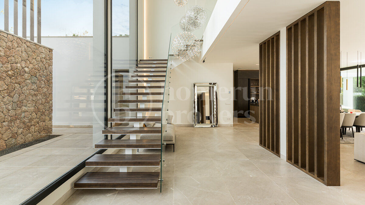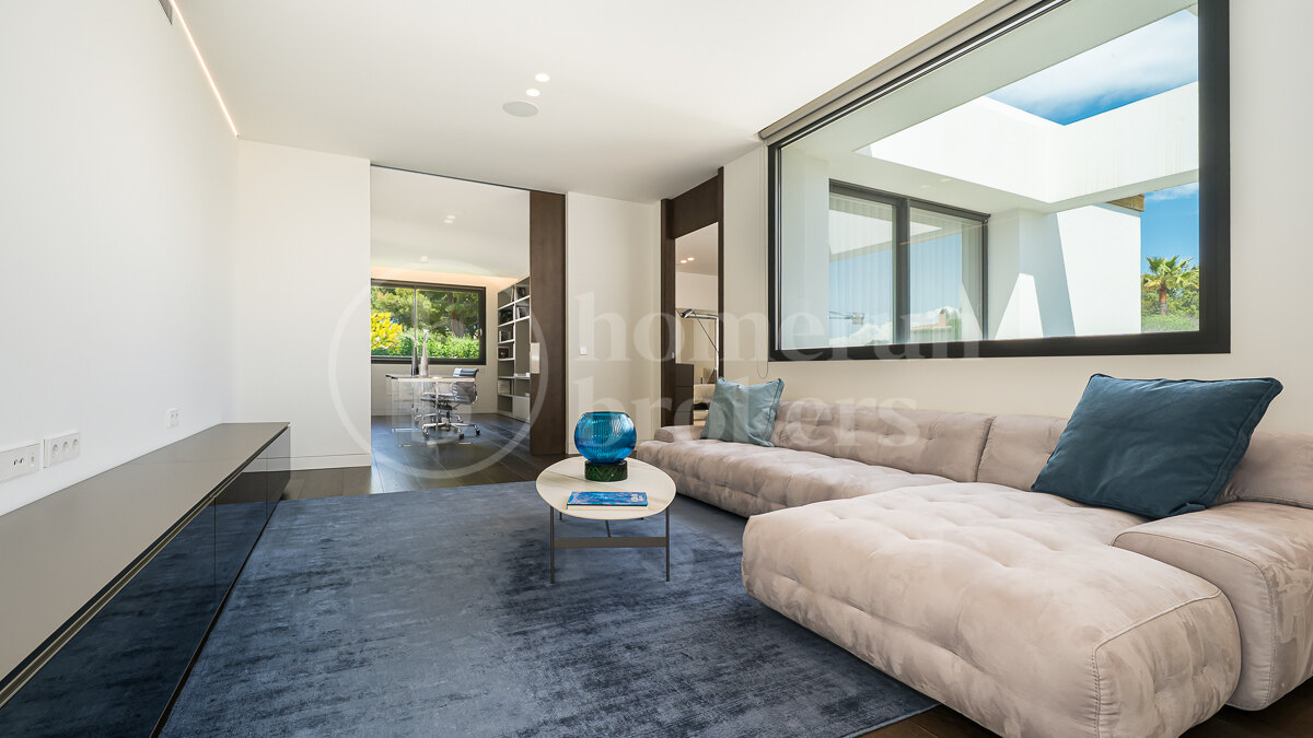Villa Montserrat is a contemporary designer villa for sale located in the prestigious and quiet area of Nova Santa Ponça, just minutes from the luxury marina Port Adriano. Completed in 2019, the home blends clean architectural lines with natural materials, creating a refined Mediterranean atmosphere throughout more than 500 sqm of living space.
