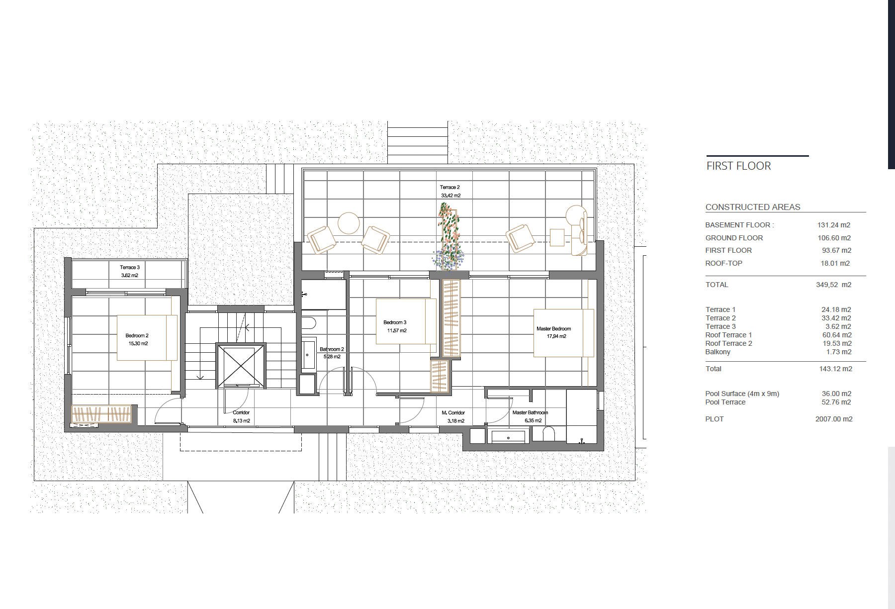 Outdoor living is central to the villa’s identity. Landscaped gardens have been designed with romantic pathways and small bridges, creating a private sanctuary for residents. At the heart of this haven lies a heated swimming pool surrounded by sun terraces, the perfect retreat for year-round enjoyment. An automated irrigation system ensures the gardens remain lush with minimal upkeep.